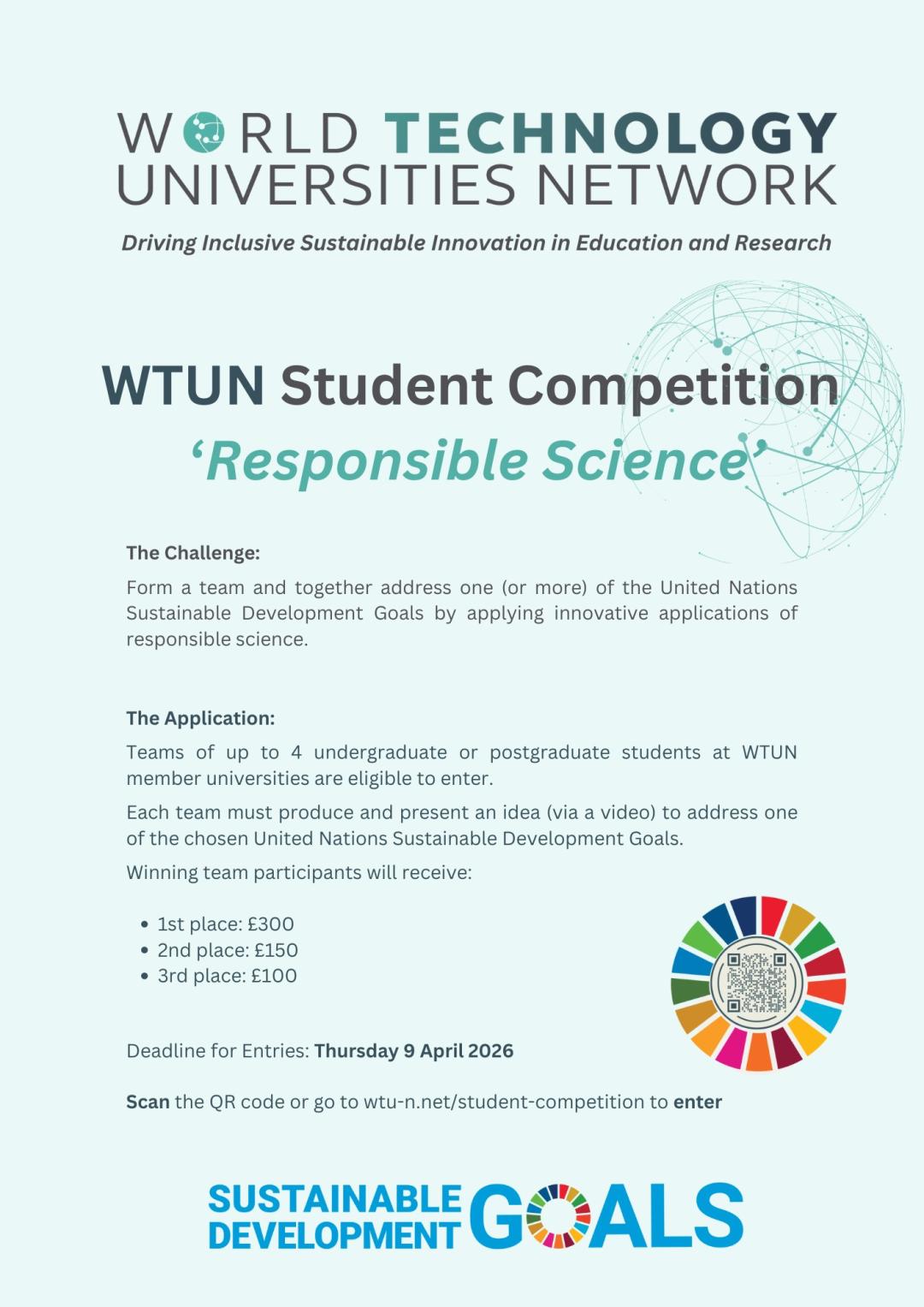 WTUN (World Technology Universities Network) เชิญชวนนิสิตระดับปริญญาตรีและและบัณฑิตศึกษา ร่วมเป็นส่วนหนึ่งของการแข่งขัน “WTUN Student Competition 2026” ภายใต้แนวคิด Responsible Science เพื่อส่งเสริมการนำวิทยาศาสตร์และนวัตกรรมมาประยุกต์ใช้ในการขับเคลื่อนเป้าหมายการพัฒนาที่ยั่งยืนของสหประชาชาติ (UN SDGs)